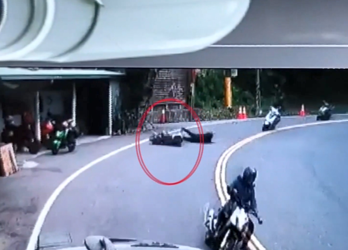 嘉義中埔的這段過彎處,一輛車子突然衝出路旁,騎士摔出車外,後面的機車也跟著犁田,另一角度監視器畫面,看得更清楚,摔車的騎士滾了好幾圈,他的車子竟然倒地後,直接撞進旁邊的雜貨店。