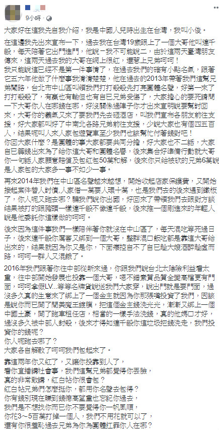 不過對此,一名自稱19歲就隨連千毅5、6年的小弟出面爆料表示,連千毅2013年帶著一幫兄弟打打殺殺,成功打亮團體名聲,「有贏也有輸,但也有自已兄弟受傷了,大家擔心的要死,請問一下大哥你人在哪?錢在哪?」事情過了不久,連千毅又請來中南北各路兄弟前往支援砸酒店,沒想到大伙都集合準備行動時,「就大哥你一句話,人家願意賠償及包紅包50萬和解,後來你只給被砍的兄弟6萬說是人家包的大家多一事不如少一事」。