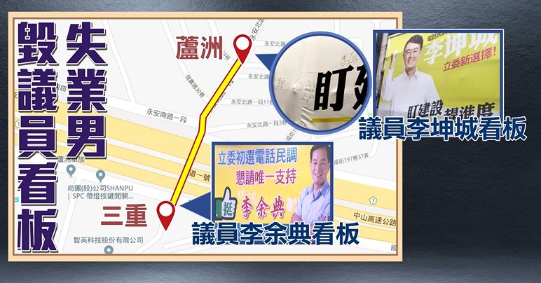 新北市三重蘆洲地區,一連發生兩起議員看板被隨機破壞事件,共通點都是寫上「騙」的字眼,兩名議員不甘受辱分別報警處理,警方一調監視器後發現,都是同一人、而且在同一天犯案!59歲的李姓嫌犯供稱,因為失業加上這次年終只領6000多元,心情不好才會亂塗鴉。