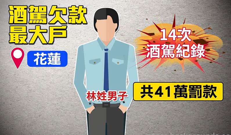 酒駕事故頻傳,公路總局花東監理站統計,花東地區近期積欠酒駕罰鍰的人數竟然有接近2000人,金額甚至高達1億190萬元,其中一名住在花蓮的林先生,因為14次酒駕積欠41萬元,原本答應分期繳納卻不守信,近期遭到凍結存款帳戶,恐怕還會再查封名下不動產。