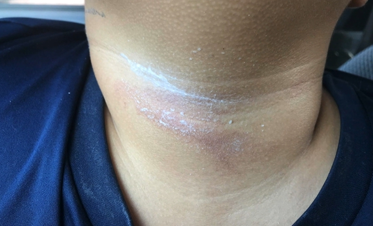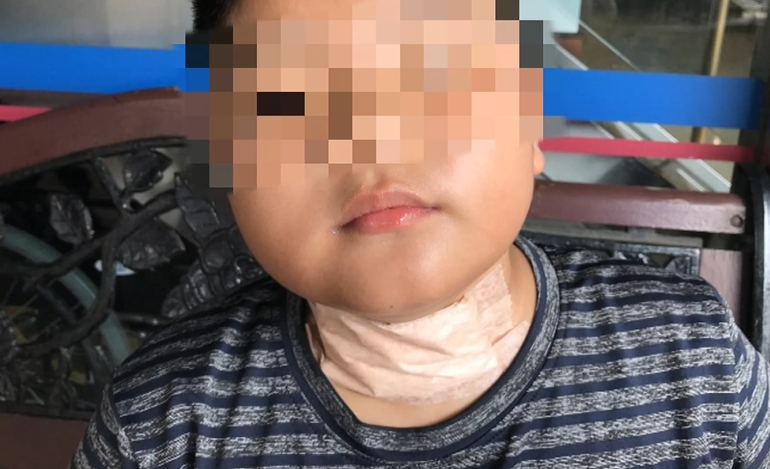 小男童的脖子上留下一長條紅腫傷痕,觸目心驚的傷勢,讓男童的爸爸既氣憤又心疼,向媒體投訴,帶著小孩到桃園一間購物中心,指控保全用紅龍勒脖。