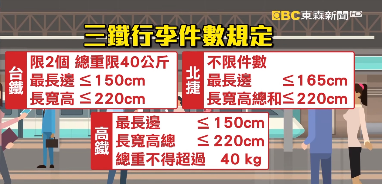 事實上三鐵的行李件數都有規定,台鐵行李限2個,總重限40公斤,最長邊最多150cm,長寬高總和最多220cm,台北捷運不限件數,最長邊最多165cm,長寬高總和最多220cm,高鐵,最長邊最多150cm,長寬高總和最多 220 cm,總重不得超過40公斤。
