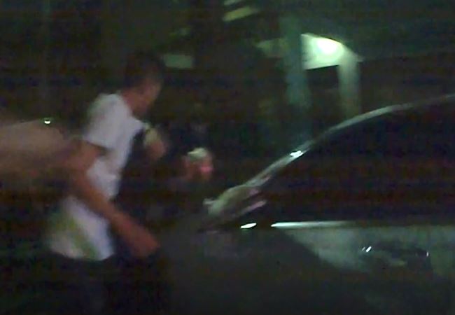 當時一名男子被人壓在,車子的引擎蓋上打,那一名酒客一拳接一拳,警察看到酒客打紅了眼,大聲斥責要酒客住手。
