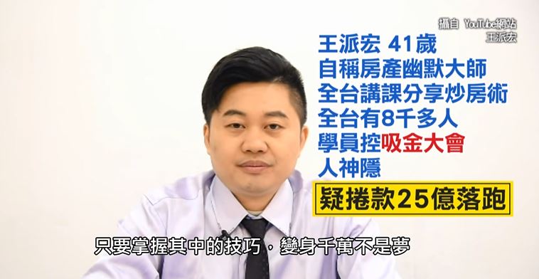 自製youtube頻道,還自稱是房產幽默大師,他是王派宏,不只在網路分享炒房術、如何理財甚至全台跑透透開課,有8千多名學員,這回卻爆出,涉嫌吸金捲款落跑25億。