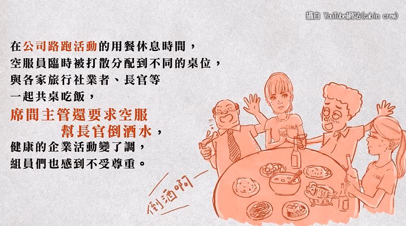 影片《你所不知的航空公司真相》:「在下著大雨的新店,為某政黨立委站台助選,遊街造勢,在公司路跑活動的用餐休息時間,空服員臨時被打散分配到不同桌位,與各家旅行業者長官等,一起共桌吃飯,席間主管還要求,空服幫長官倒酒水。」