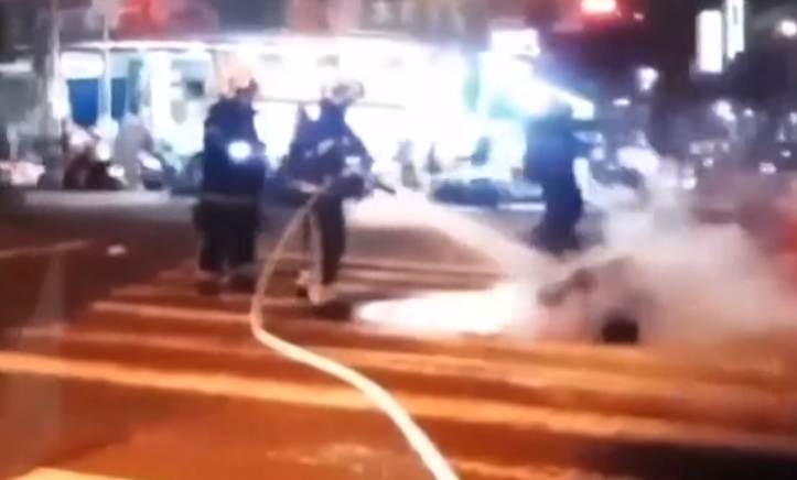 高市警苓雅分局交通分隊長 李重臻:「車輛撞上後,駕駛與車體馬上就分離,倒臥在路中,蘇姓駕駛的機車馬上有燃燒自燃的現象,我們警消獲報後,馬上趕赴現場將火勢撲滅。」