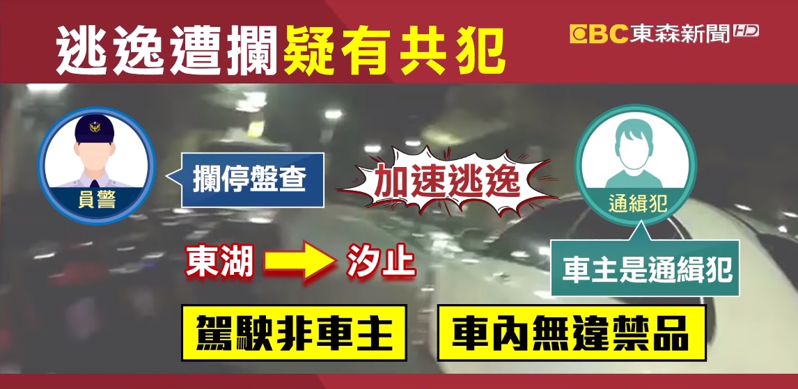 台北市內湖地區,昨(3)日晚間發生警匪追逐案件,一輛白色轎車違規停車,警方透過車籍資料發現車主是名通緝犯,立即上前盤查,但駕駛卻加速逃逸,就在馬路上一路逆向超車又闖紅燈,員警追到巷子裡要求駕駛下車,這才發現開車的不是通緝犯車主,車上也沒有查獲違禁品,讓警方懷疑可能有共犯已經趁隙脫逃。