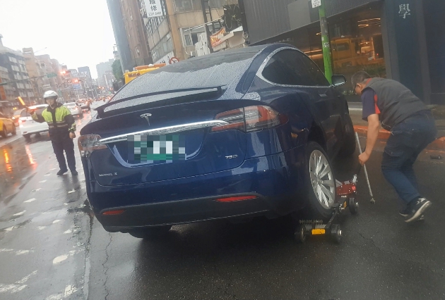 ▼特斯拉輪胎被撞歪,趕緊請來拖吊業者幫忙(圖/東森新聞)