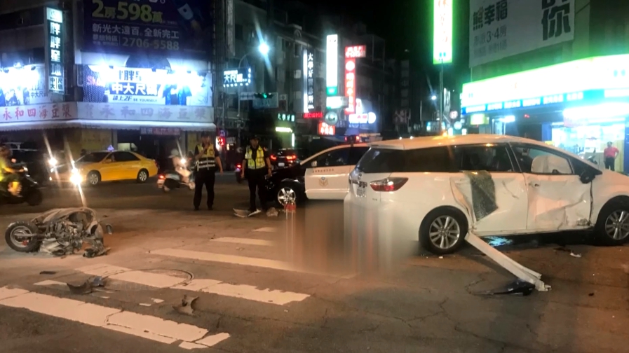 十字路口發生重大交通事故,機車殘破到幾乎只剩下支架,車殼零件四散一地,白色休旅車的保險桿脫落,引擎蓋掀起,車頭幾乎全毀,兩台車上都還有白色粉末,因為不久前機車撞到休旅車,整個塞進車下底盤後,碰的一聲就起火燃燒。