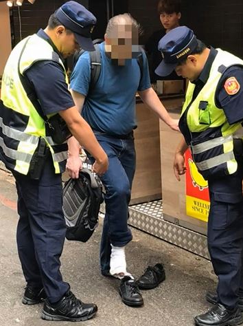 藍衣美籍男子背著包包遭到兩名員警盤查,他把鞋子脫了,露出了一部分,這個動作就是因為裡面藏著的是一個偷拍針孔。