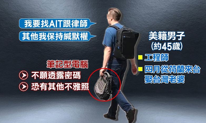 事隔一天,外籍男子的律師也趕赴派出所關心,事後一查這名美籍男子年約45歲在台灣娶妻,今年四月因為工作從荷蘭來台,在被發現裝針孔後,他就跟警方說要找AIT跟找律師,其他都保持緘默權,但警方發現他身上的這台電腦,他卻百般不配合,所以研判裡頭疑似還有其他不雅照片。