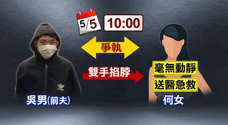 據了解,已經離婚10年的兩人偶爾還會同居,五號晚上10點,兩人疑似因為金錢問題,吳姓男子表示吃藥要先就寢,不過何姓前妻卻不罷休導致兩人發生爭執,吳姓男子一氣之下,勒住前妻脖子,倒頭睡了一個小時,起床發現前妻躺在地上毫無動靜,立刻將他送往醫院急救。