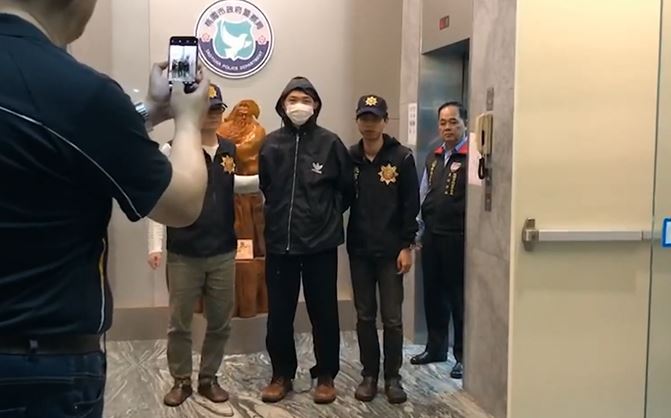 吳姓男子被戴上手銬,因為他前不久勒昏他的前妻,導致前妻一度失去生命跡象,大批刑警將他帶上警車。