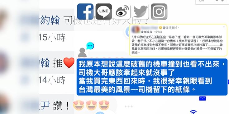 民眾紛紛讚賞,而機車車主也把照片Po在網路上表示,我原本想說這麼破舊的機車撞倒也看不出來,司機大哥應該牽起來就沒事了,當我買完東西回來時,我很榮幸親眼看到台灣最美的風景,司機留下的紙條上面也寫著「臨停卸貨擦撞到您的機車,如有受損麻煩請來電告知,修理費用我會負擔,謝謝抱歉了」。