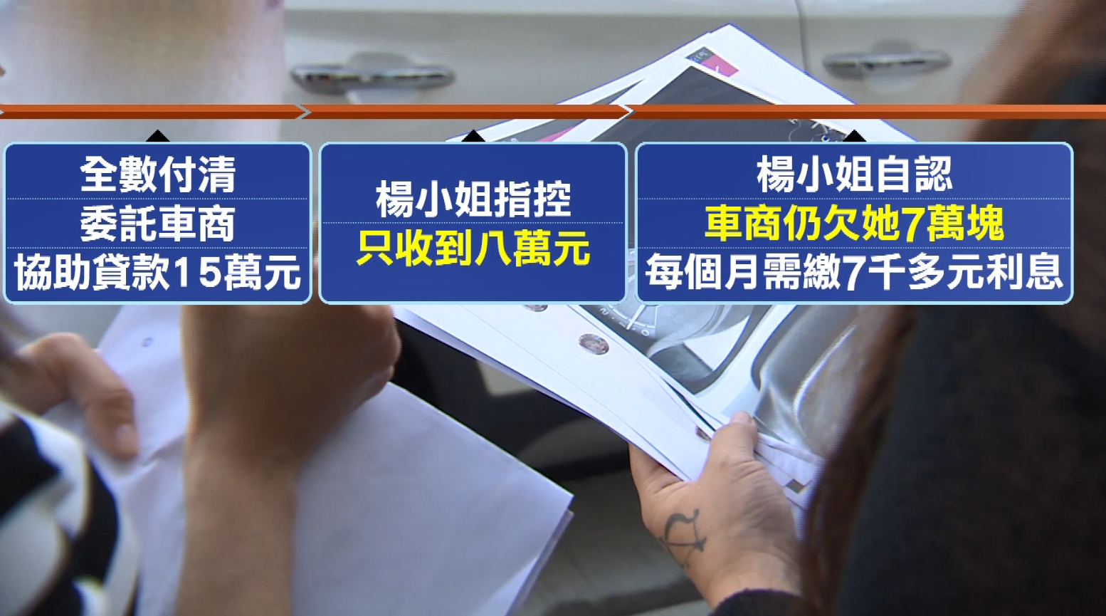 被投訴車商駁斥楊小姐說法,不過楊小姐還質疑,第一輛車以同事名稱交車,也委託車商幫忙處理,貸款了15萬元,卻只收到8萬元,楊小姐認為車商還欠她7萬塊,現在每個月自己還要繳7000多的利息,雙方最後因為車輛問題,還簽下和解書,但問題又來了。