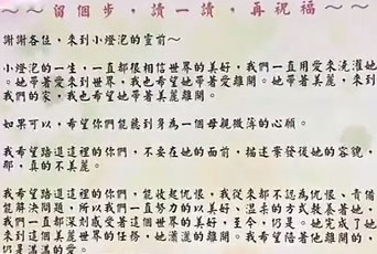 小燈泡媽媽說,物資捐款真的不需要了,現場的東西非常豐富,希望不要增加大家困擾,也謝謝大家的心意,提供卡片讓大家填寫追思,也在靈堂門前貼上告示,內容令人動容。