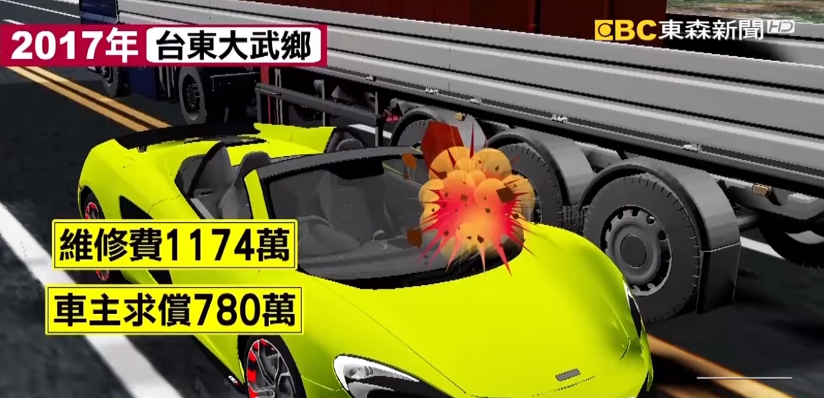 高雄一名陳姓司機2017年開聯結車行經台東時,車上載運的鐵塊掉落彈起,竟然砸中對向的超跑麥拉倫的擋風玻璃等,維修費高達1174萬,肇事司機因此嚇到跑路,而車主獲得保險理賠後,保險公司轉而向車行和司機要求連帶賠償780萬,老闆娘無奈的說,這天價賠償,她也賠不起。
