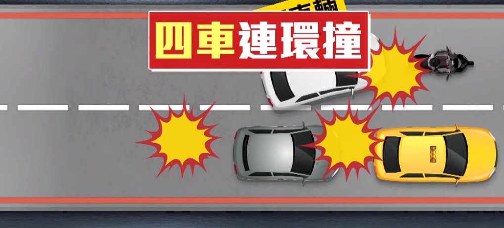 劉姓青年酒駕闖禍,被他撞上的銀色轎車,又追撞了前方一輛計程車,導致小黃噴飛到對向,而白車在第一次擦撞後,又失控衝撞一台才剛要起步的機車。