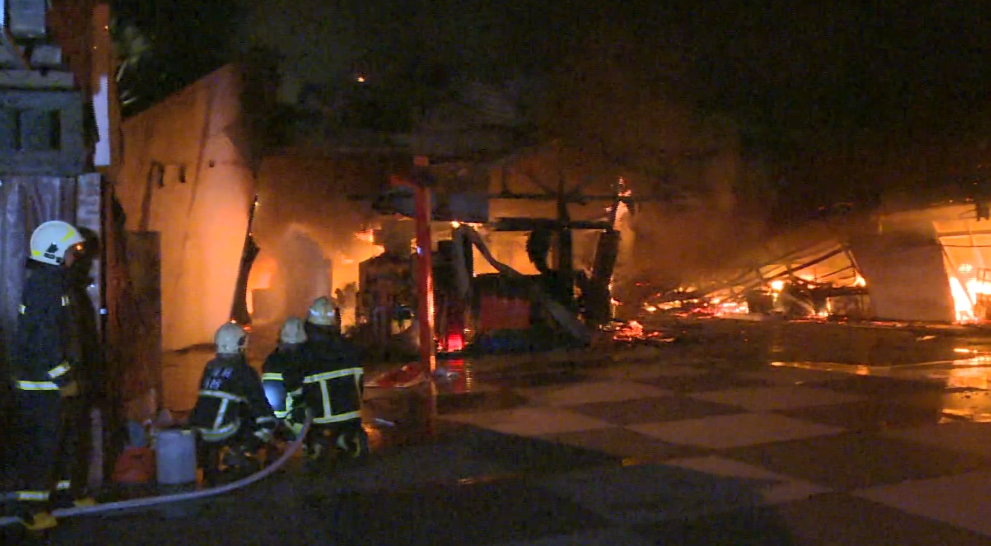 花蓮東大門夜市今(3)日凌晨1點左右,突然冒出猛烈大火,熊熊火光照亮夜空,徒步區陷入一片火海,且還傳來爆炸聲響,消防局接獲報案後趕緊前往灌救,粗估約有40個攤位燒毀,所幸火勢並未造成人員傷亡,起火原因還有待調查。
