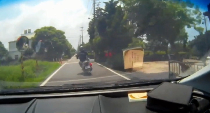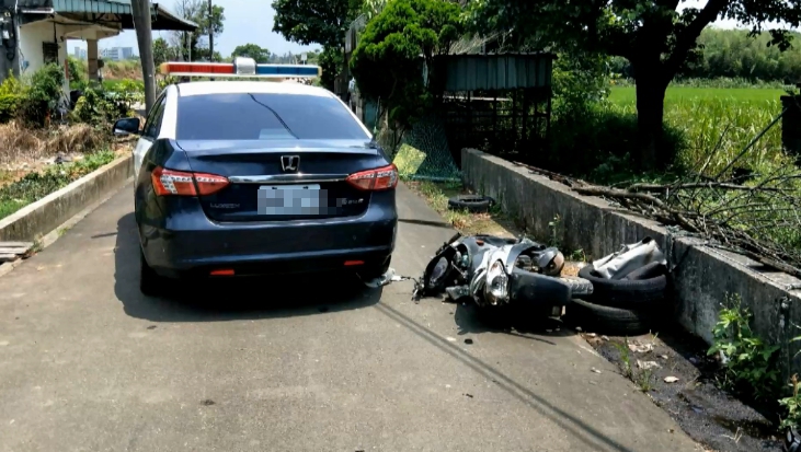 男子騎著機車多次回頭望,發現警車在後頭,趕緊加速逃逸,這時警車鳴笛尾隨,一路追趕,下一秒,男子左轉時,一個重心不穩,連人帶車直接撞上路旁橋墩。