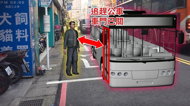 公車靠站,一名女乘客急急忙忙上了車,駕駛看沒有其他乘客要上下車,就準備關門起步,但是這時候仔細看,有一名男子伸出手想要上車,卻被關閉的車門夾到,下一秒換個角度來看,公車緩緩駛離,男子已經倒臥在地上一動也不動。