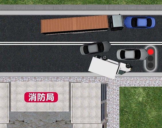 事故現場一片凌亂,零件四處飛散,滿地都是碎玻璃,被撞的小貨車90度側翻,車斗上的貨品散落滿地,另一台深色轎車擋風玻璃全碎,車頂上也都是小貨車掉落的貨品,車禍發生在消防隊前,救護車立刻出動鳴笛閃燈,前往救援。