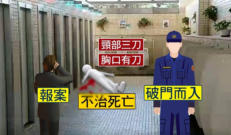 竹北分隊員陳雨聖:「身上的傷口為頸部約有四處,大約是2X3的傷口,他胸口部分為刀身沒有刀柄,位置是在心窩的部分。」