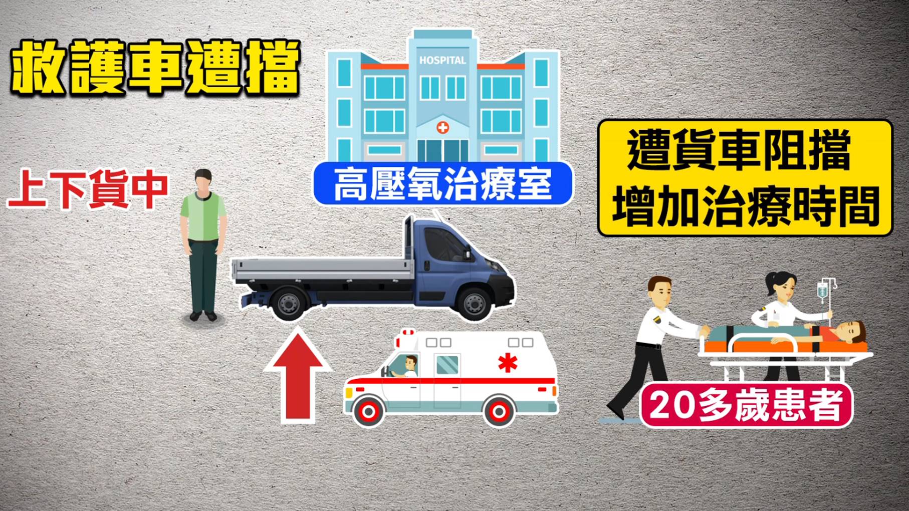 民間救護車業者林經理:「因為他這一趟,這算是一個,要做高壓氧的治療,為什麼要走到他那個,批貨區的地方,因為比較近,大概5分鐘3分鐘就到了,但是如果按照正常的路線,上面第一層樓,就會出現很多的麻煩。」