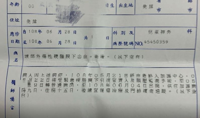 他現在沒有死亡,算我們很幸運,那天醫生這樣講,醫生是說這個,一定就是外力撞擊,不是他自發性出血,然後也請我們去報案,因為他大概了解說,是保母帶過去的狀況。