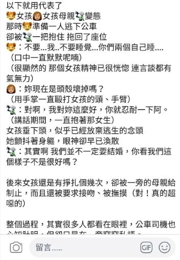 女孩歷經一番掙扎,卻遭一旁女子制止,甚至頻頻被男子撫摸還被要求接吻。全程司機及乘客都看在眼裡,不過大家僅在一旁竊竊私語,無人願意挺身而出。原PO表示,無法對此事坐視不管於是下車後立刻報案,警方尋線追查到這部公車,但這三人早已下車。