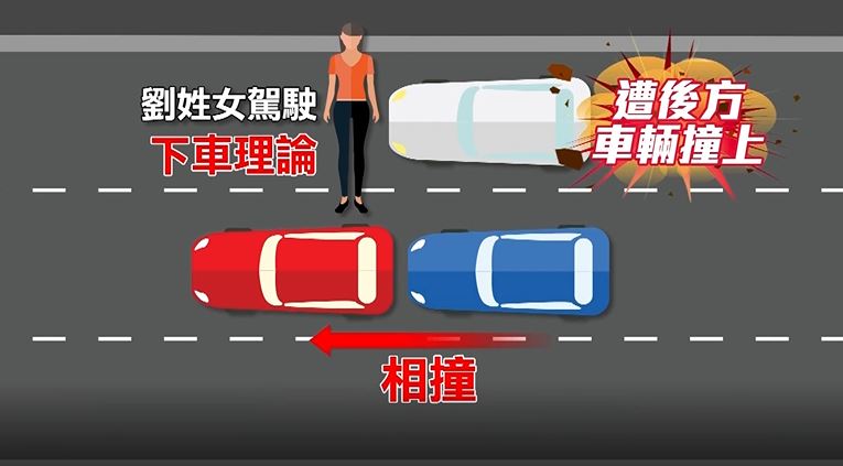 ▼劉姓女駕駛疑似下車想要了解狀況,卻遭到後方BMW車輛迎面撞上。(圖/東森新聞)
