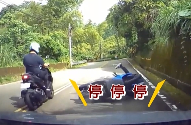 ▼機車騎士當時想超車,竟因水溝的青苔不慎打滑自摔。(圖/取自YouTube Bin Bin)
