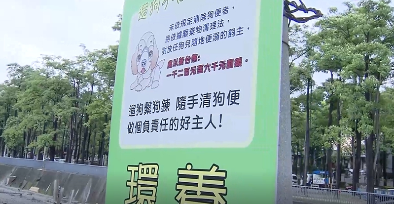 ▼河堤旁告示牌提醒民眾記得繫狗鏈、清狗便,卻有民眾遇到人拿電擊棒要攻擊他的毛小孩。(圖/東森新聞)