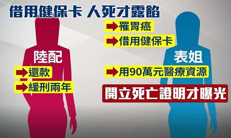 拿健保卡看病是台灣人再熟悉不過的日常,可別貪圖一時方便借給別人使用,健保署最近就抓到,有一名大陸籍配偶,去年把健保卡借給自己罹患胃癌的表姊使用,一共用了90萬元的醫療資源,一直到表姐過世開立死亡證明瞞不下去了,這名陸配才說出實情,不但得返還款項,也被判緩刑兩年。