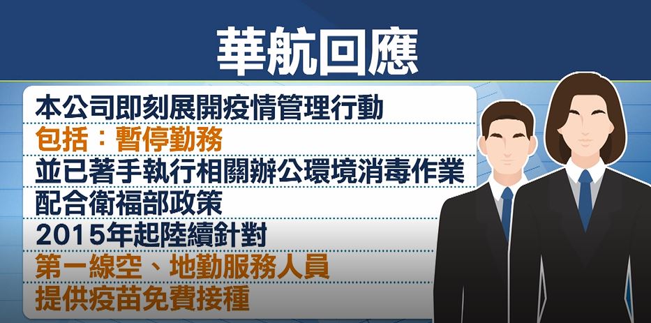 根據疾管署資料,這名地勤人員在7月20、22及23日期間,曾經到桃機第一、第二航廈值勤,也曾經到地下2樓美食街用餐,甚至也搭乘過桃園捷運,因此也建議有相關活動史的民眾自主健康管理18天,而華航則是回應,公司已經展開疫情管理行動,暫停這名地勤人員勤務,也進行辦公環境消毒,同時也強調配合衛福部政策,2015年開始陸續針對第一線空、地勤服務人員,提供疫苗免費接種,而衛生單位初步已經掌握接觸者共73人,將持續監測到8月11日,民眾如果有發燒、紅疹等疑似症狀,也要盡速跟衛生單位連繫。