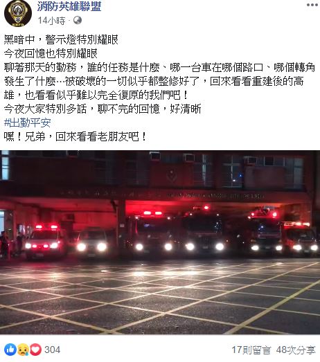 「消防英雄聯盟」也貼出一段新興消防分隊消防車和救護車排成一排,在暗夜中閃燈鳴笛的影片,並貼文「黑暗中,警示燈特別耀眼,今夜回憶也特別耀眼,聊著那天的勤務,誰的任務是什麼、哪一台車在哪個路口、哪個轉角發生了什麼?被破壞的一切似乎都整修好了。」