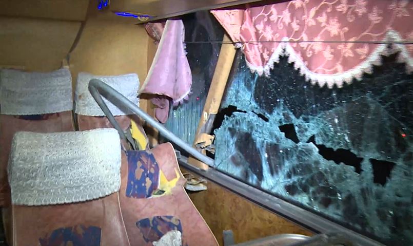 車窗幾乎全碎,就連車身也有一道明顯擦痕,走進遊覽車內部,車內走道滿是玻璃,座位也難以倖免通通灑滿碎玻璃,可以想見當時撞擊力道之大,車上共有六名乘客受傷送醫。