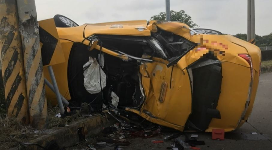 計程車失控撞上電線杆車身90度翻轉,司機卡在駕駛座上乘客則是被甩出車外。