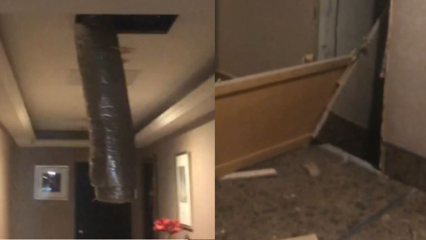 甚至中和一棟大樓的走廊天花板也因為地牛翻身整塊剝落掉下,本來該在天花板上的物品散落一地,也阻擋走廊通道,民眾驚魂未定,趕緊出來察看,發現走廊上一片混亂,甚至本來藏在天花板內的管線,也因此掉落下來。
