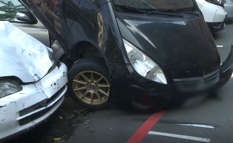 停車場內,一輛黑色小客車呈現45度,直接壓在兩輛小客車上方,正下方的銀色小客車嚴重變形,擋風玻璃全毀,旁邊的白色車輛車頭也遭到波及,車蓋毀損翹了起來,有民眾看到事發當下的經過,直呼真的好誇張。