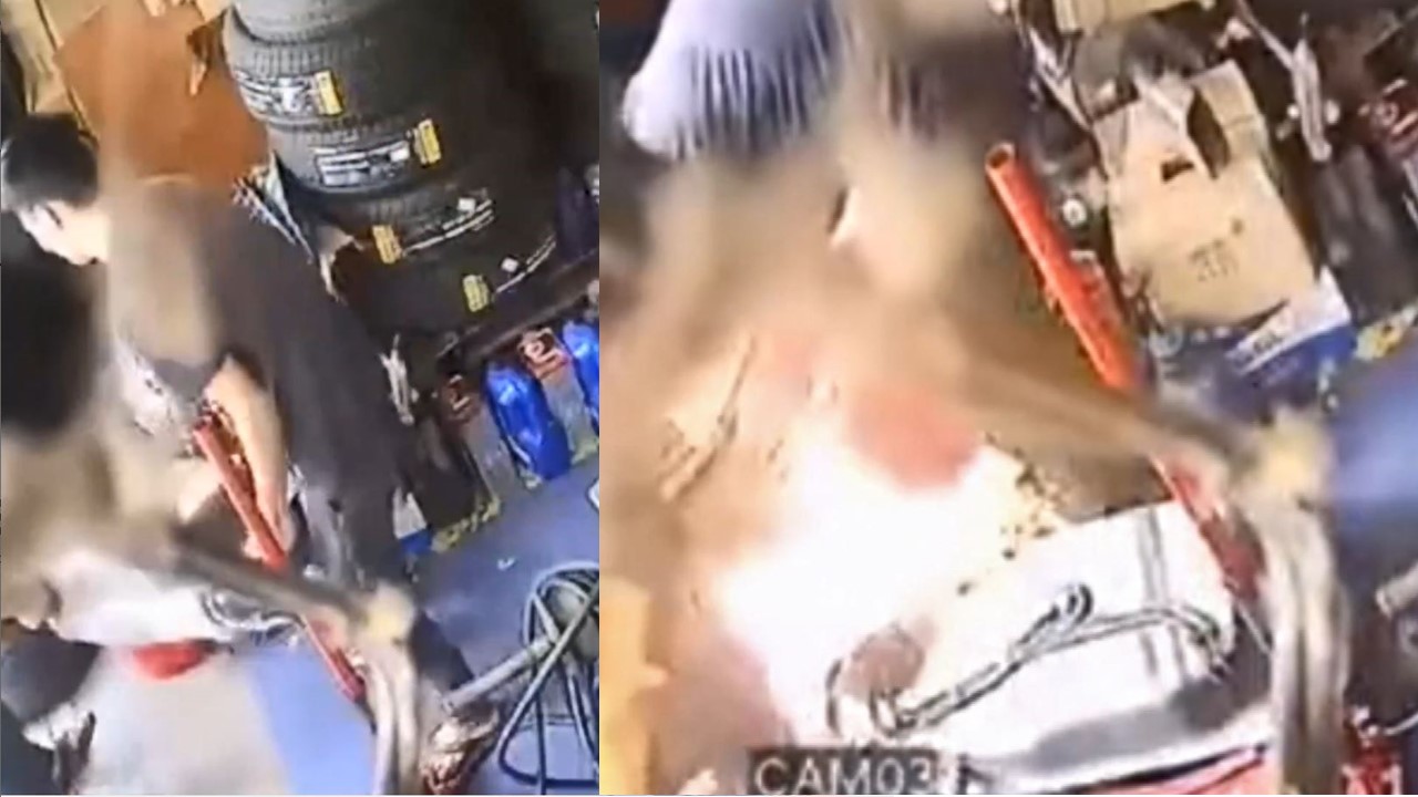 兩名修車廠員工合力拆下汽車油箱後,將油倒入旁邊的塑膠桶,不過當其中一人拿起塑膠桶時,突然從地面竄出火光,火勢瞬間蔓延,發生大爆炸,整間店陷入火海。