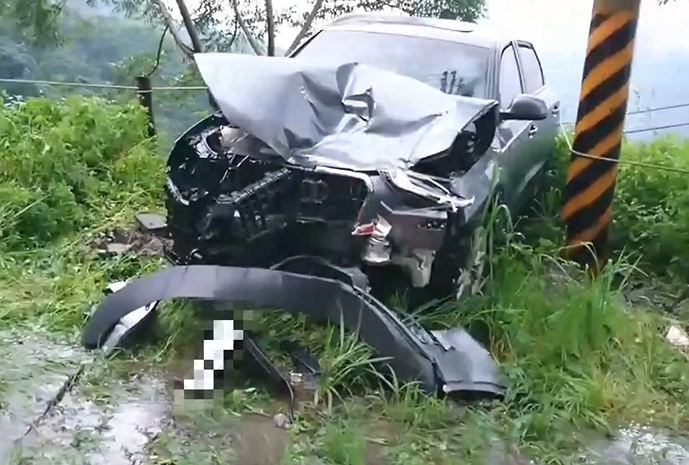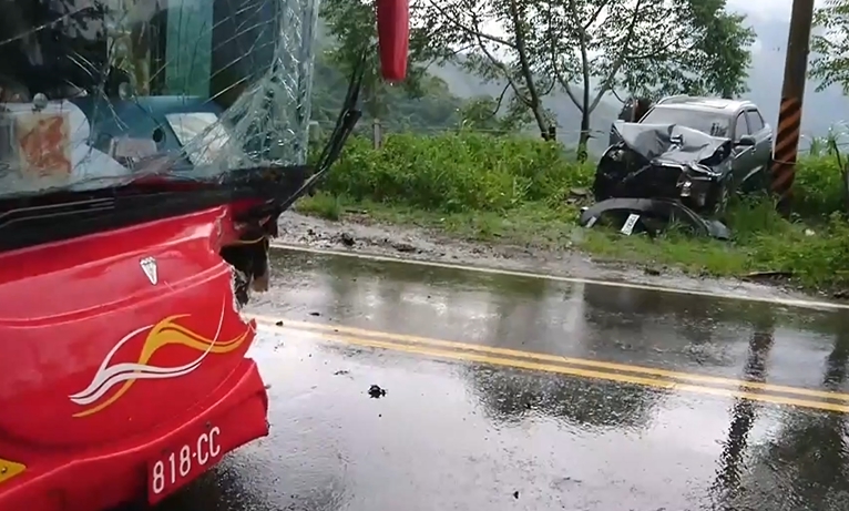 休旅車山路跨越雙黃線,撞擊遊覽車,整台車彈飛卡在邊坡。