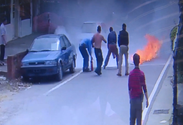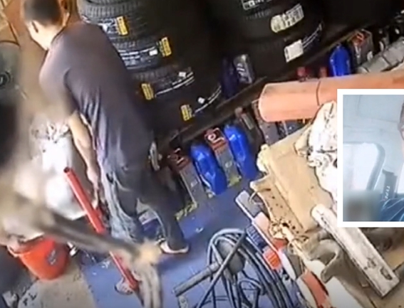 兩名修車廠員工合力拆下汽車油箱後,將油倒入旁邊的塑膠桶,不過當其中一人拿起塑膠桶時,突然從地面竄出火光,火勢瞬間蔓延,發生大爆炸,整間店陷入火海。