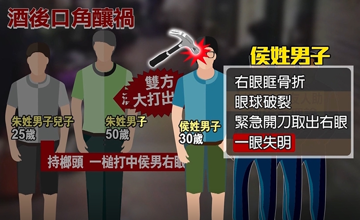 隨後侯姓男子被送往市區的醫學中心,而受傷的侯姓男子原本是和朱姓酒友在喝酒,酒後發生激烈口角,雖然當場被人勸開,但是侯姓男子氣不過,找來三名朋友助陣到朱家理論,雙方大打出手,朱姓男子兒子眼看父親不敵對方人多,心急救父就拿著榔頭衝出來,一槌就打中侯姓男子右眼,造成侯姓男子當濺血,他的右眼眶骨折眼球破裂,緊急開刀取出右眼,一眼失明。