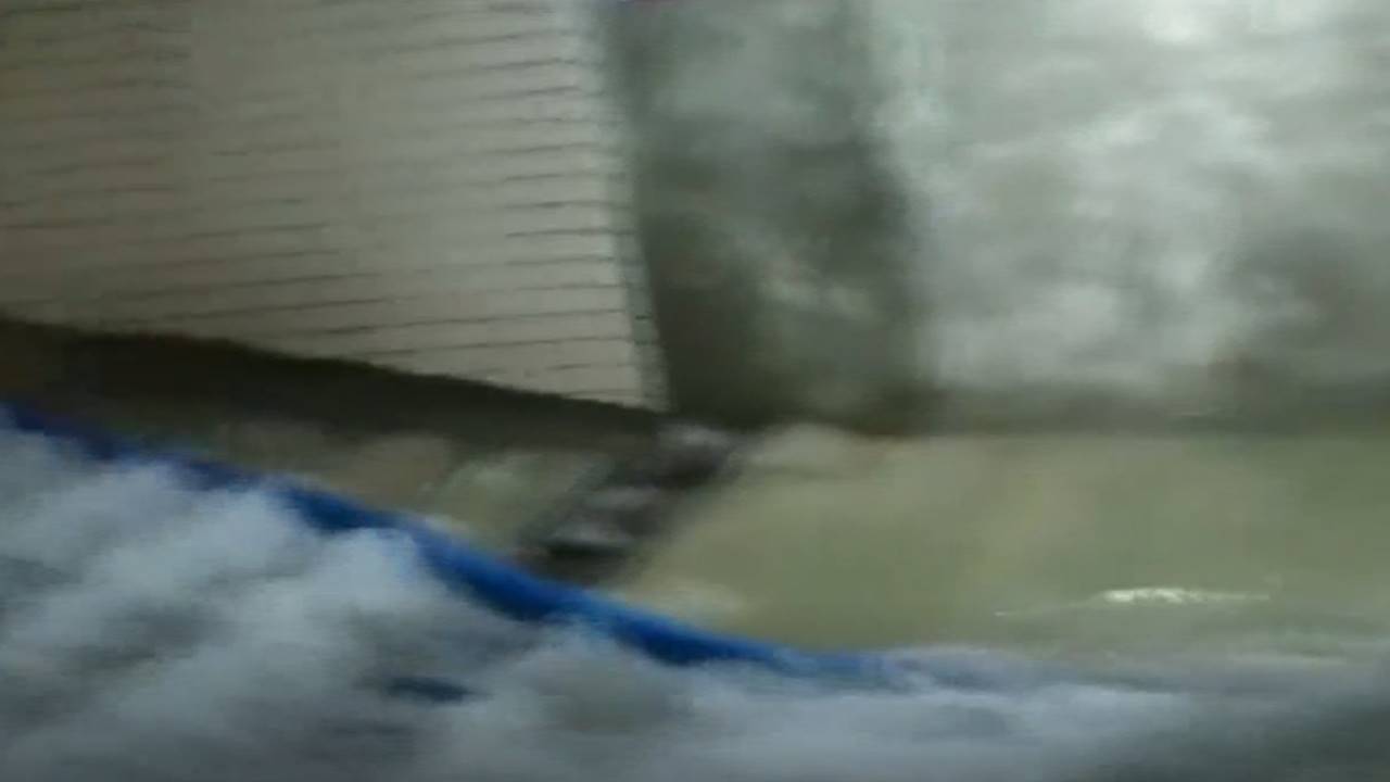 ▼通往地下室的坡道就像瀑布,雨水傾瀉而下。(圖/東森新聞)