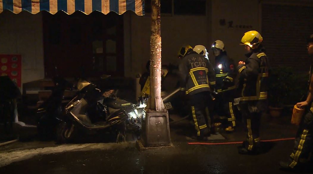 消防弟兄擔心機車突然來個什麼爆炸的,不敢靠得太近,朝兩輛機車噴水灌救,事發時間17日凌晨一點多,台中西區向上北路189巷,民眾發現機車起火立即通報119消防隊 。