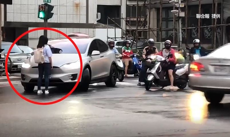 車來車往的大馬路口,這名穿著白色T恤,背著後背包的長髮女子,站在百萬電動車前,一下整理衣服,一下摸摸頭髮,綠燈亮了,但她完全沒有移動的意思。