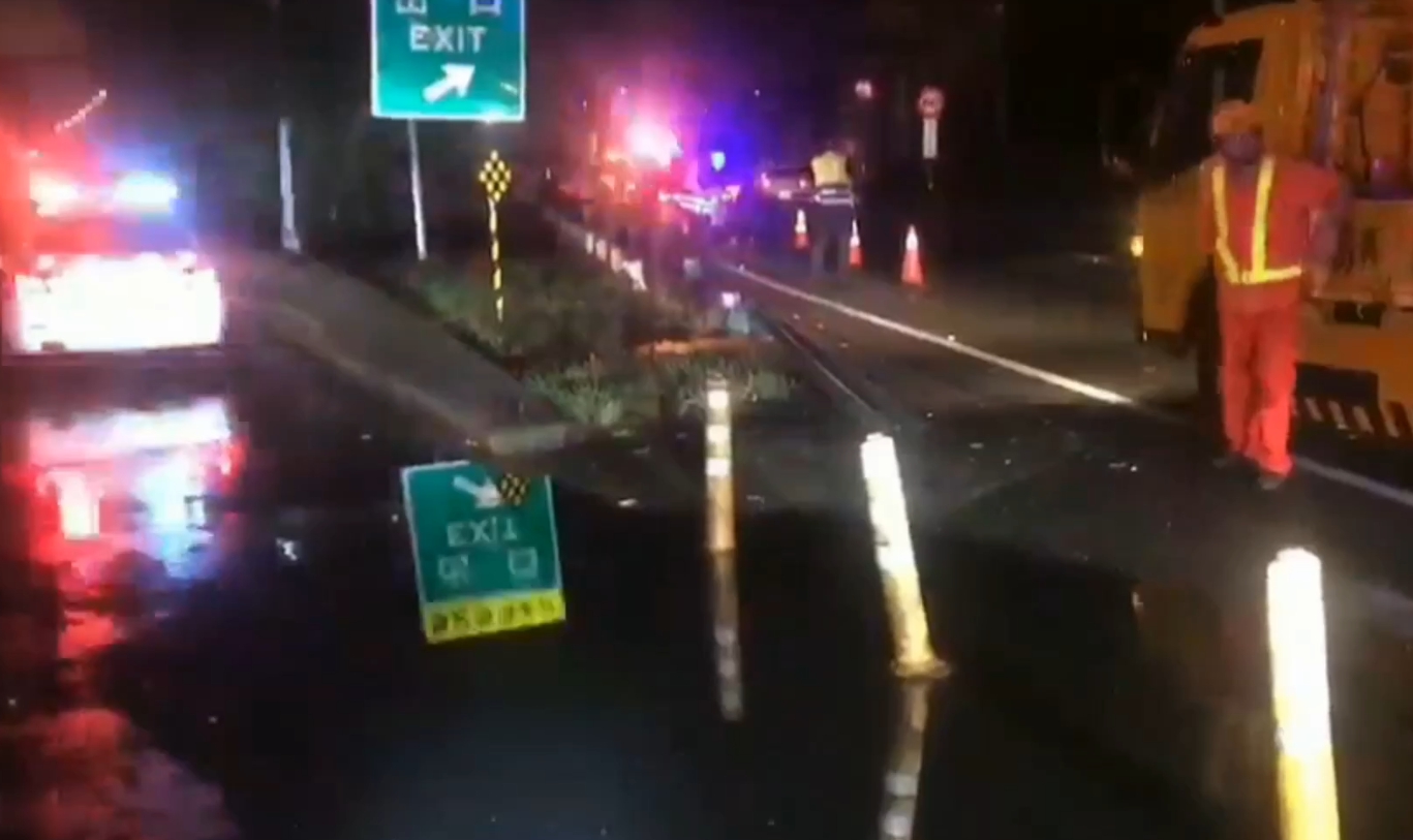國道一號中山高速公路,連接國道二號機場系統匝道,工程車以及公路警察都聚集在這,因為一部白色轎車翻覆在水泥柱旁車頭向下,宛如倒栽蔥,裏頭的駕駛因為陷入昏迷被送往醫院搶救。