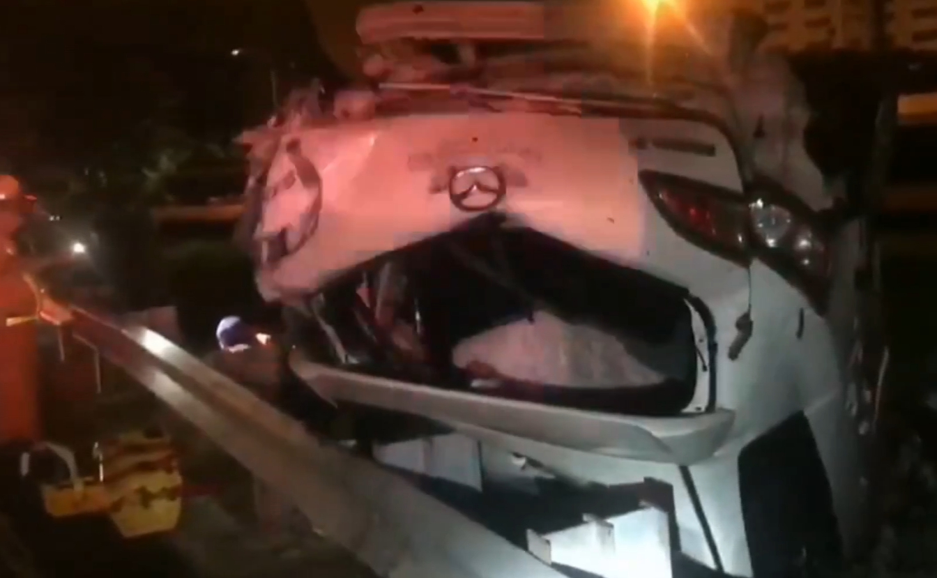 靠近一看,轎車後車燈破裂,車門凹陷,車身鈑金多處受損,就像是被凹折一樣,情況相當嚴重。