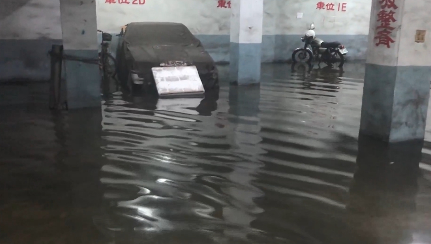 管理員:「大樓因為那天傾盆大雨,灌到大馬路,用灌的一樣,地下室的水淹淹淹,淹到現在。」